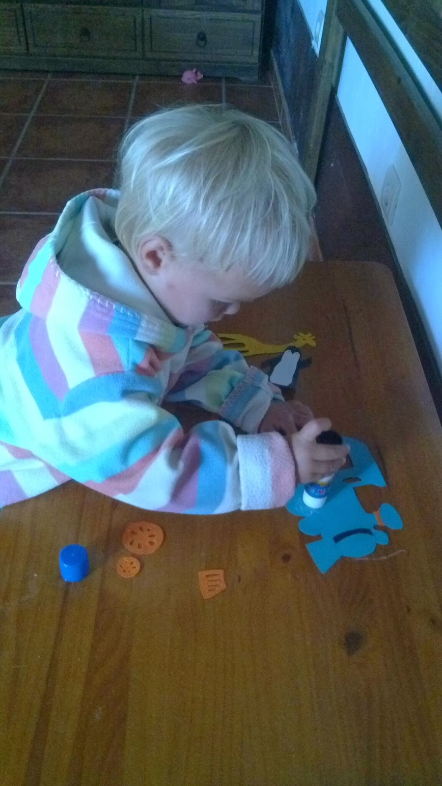She enjoys playing with glue very much, she could smear all over the place, so I give her the opportunity. But the games do not last long in this age, so I tried to make it short and splitted it in two days.